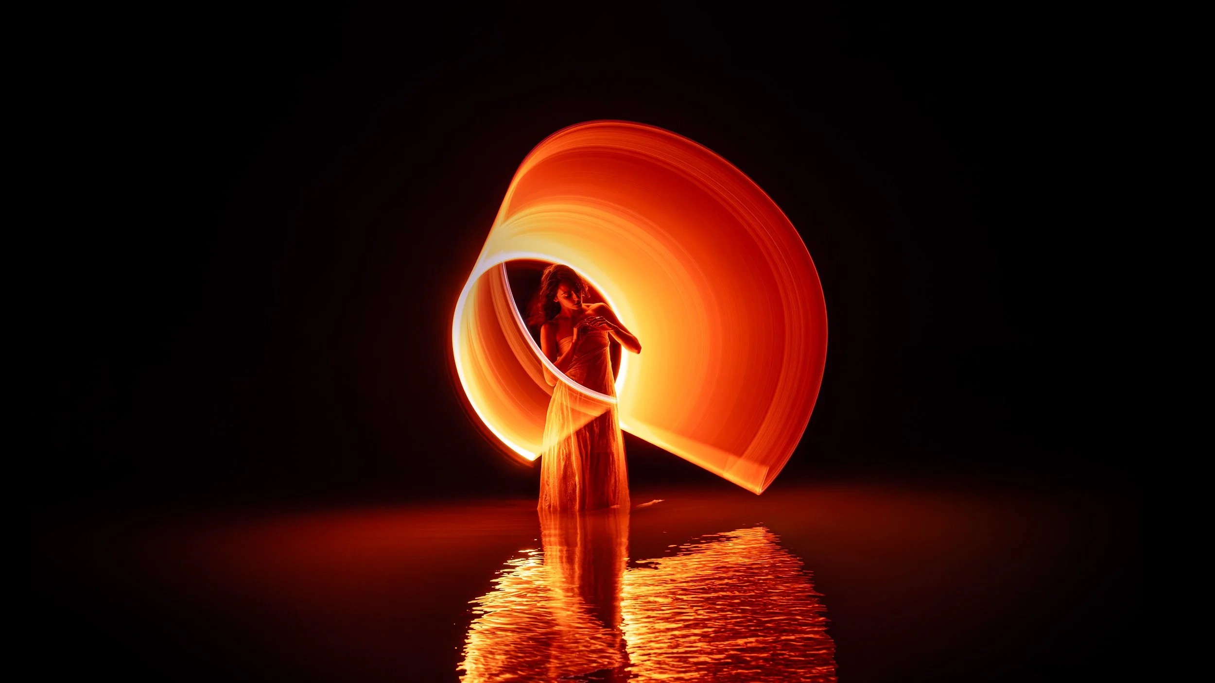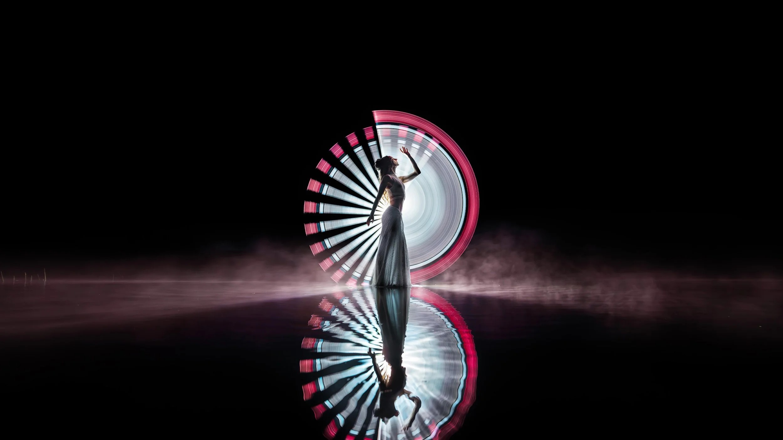 We always use reflection to add depth to the image when shooting Black Canvas. Central composition usually works best, as it keeps the focus on the main elements: the light painting, the model, and their reflection.