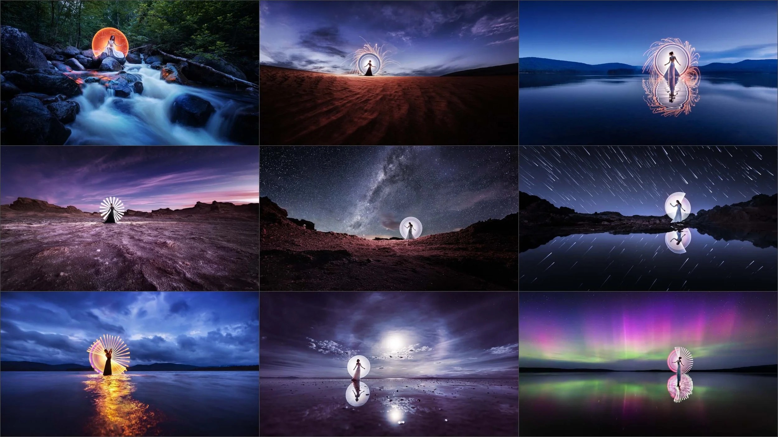 Black canvas is the simplest and most accessible approach to outdoor tube light painting. By not including most of the landscape elements in the long exposure captures, it focuses on the essence of the technique: the human subject and the light painting itself.