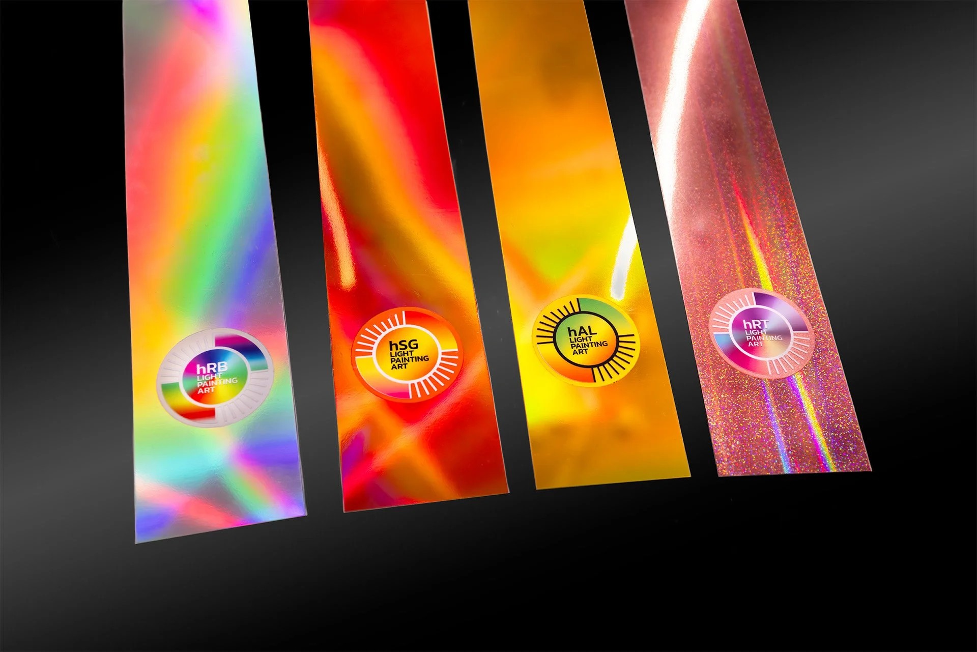 - Holographic feathers. They add an unpredictable iridescent effects to the trace of light.