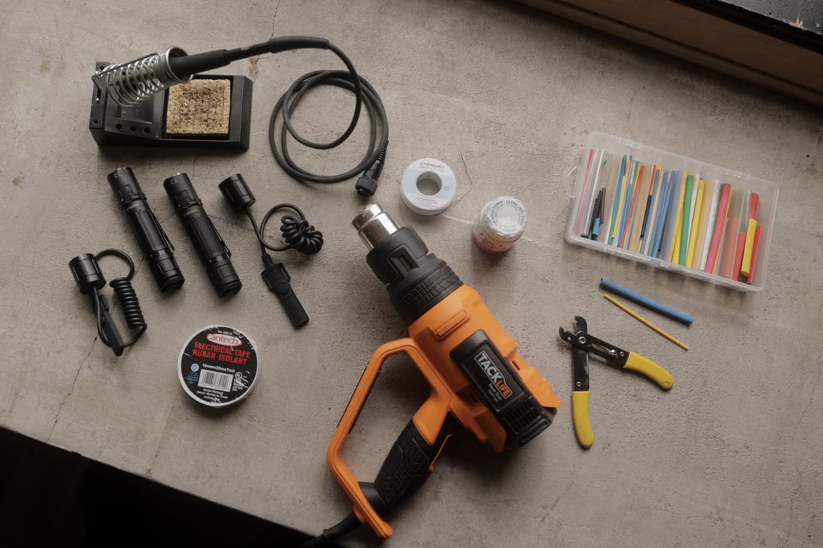 - Where can I buy the materials? We've linked the flashlight models above. For the rest (soldering iron, solder, flux paste, heat shrink kit, wire cutters and strippers, heat gun), any well-stocked electronics or hardware store should carry everything you need.