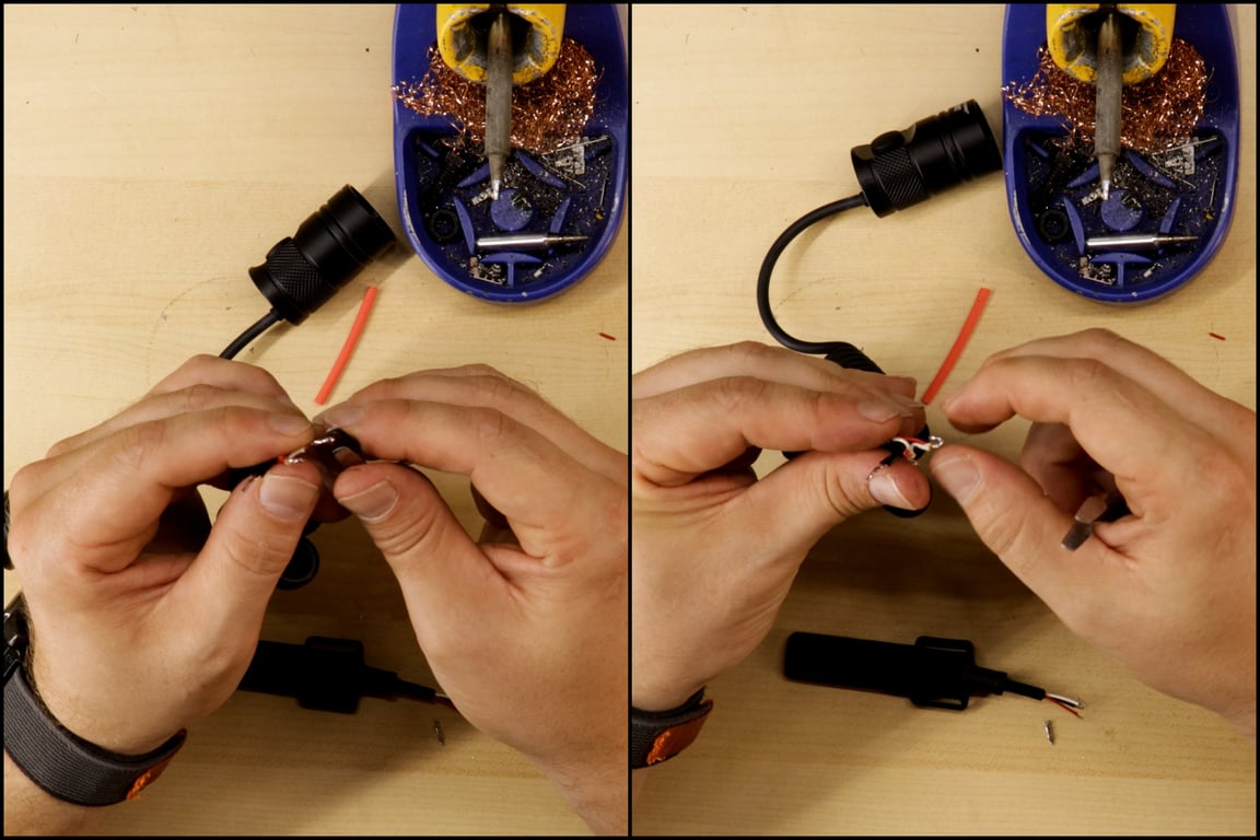 - Cut a piece of the larger heat-shrink tubing and slide it down the cord on the flashlight-connector end, out of the way of where you'll be working. This will cover all the connections at the very end.