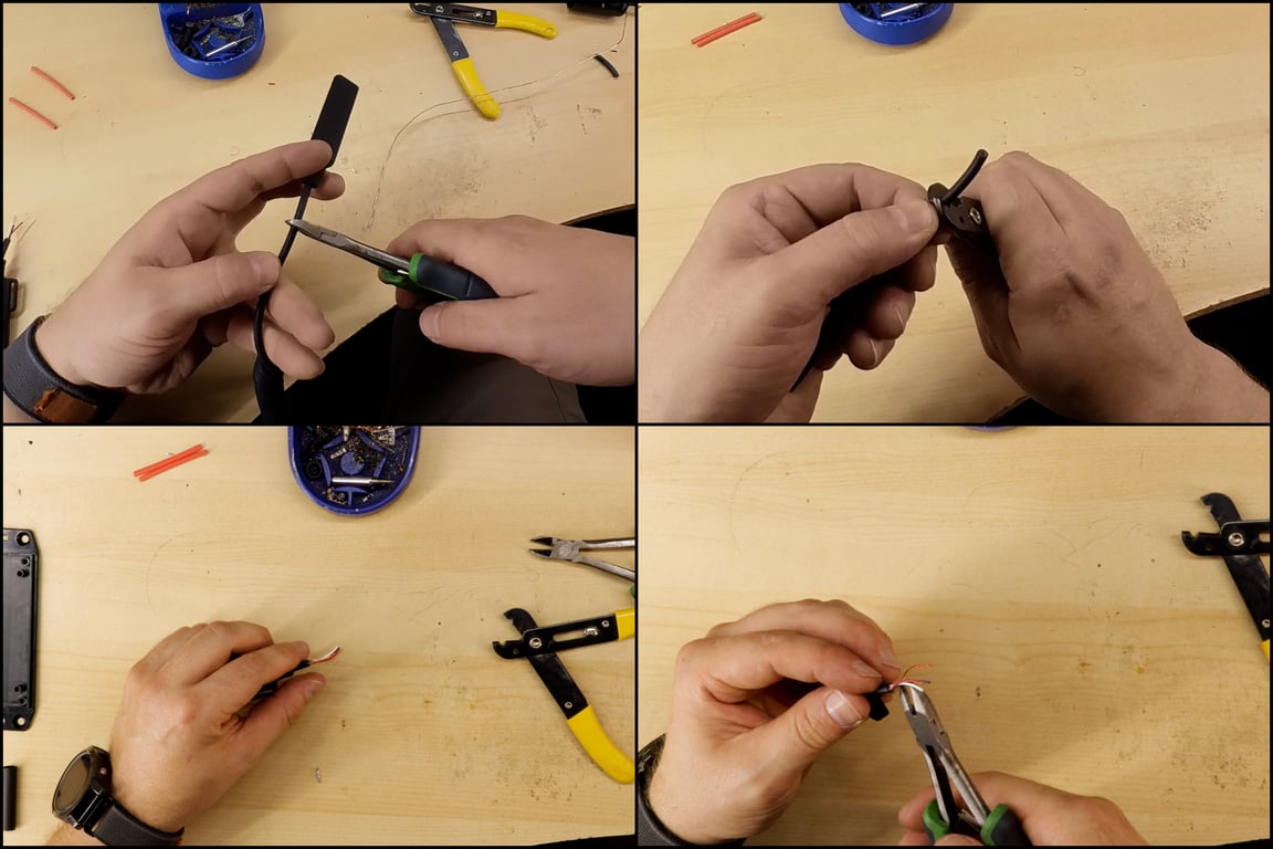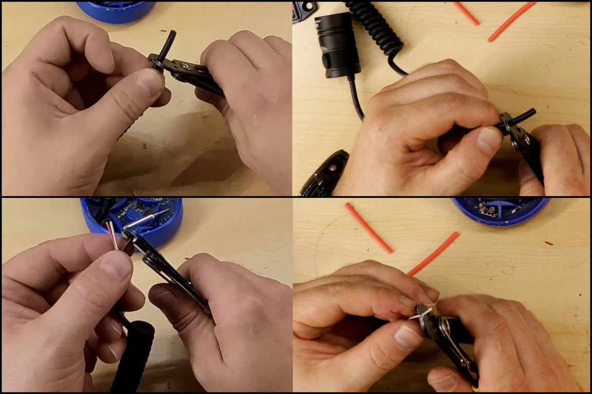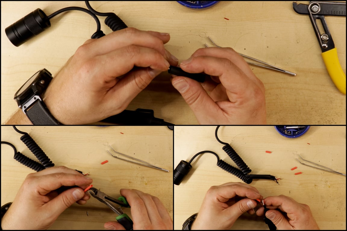 - Bend each of the three conductors on the remote or pressure-switch end into a small hook. Do the same for the three joined conductors on the flashlight end. Interlocking these hooks before soldering creates a stronger mechanical connection.