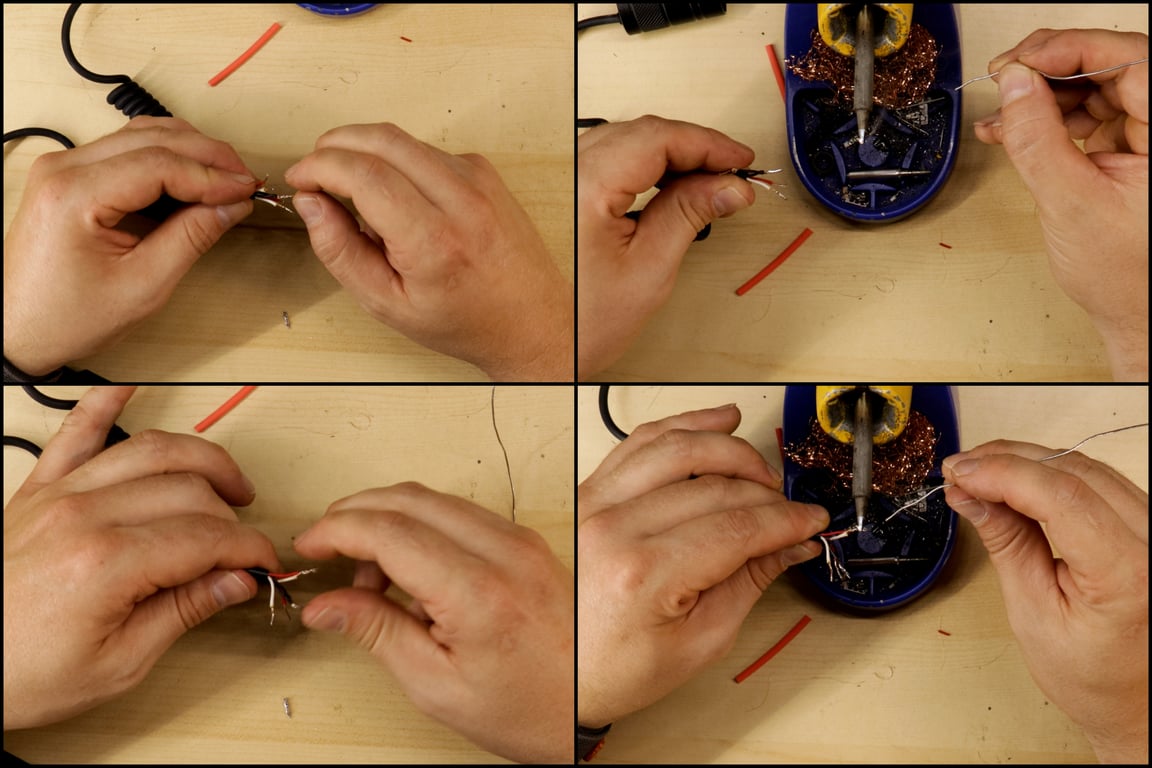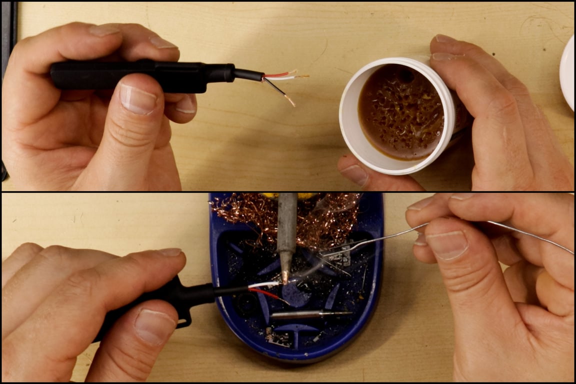 - Apply flux paste to each exposed conductor, then pre-tin them with a thin coat of solder.