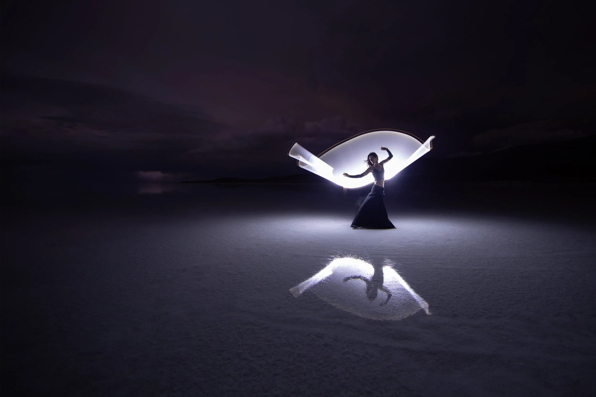 Un facteur important dans cette technique est d'ajuster l'intensité des outils de light painting. Lorsqu'on augmente l'ISO et qu'on ouvre le diaphragme, la lumière de notre lampe torche devient nettement plus puissante. Sans réduire la lampe torche, les formes de light painting se surexposent, et on perd l'équilibre entre le sujet et l'arrière-plan. Pour contrer cela, on réduit graduellement la puissance de la lampe torche, ce qui permet de garder nos compositions bien exposées et harmonieuses.