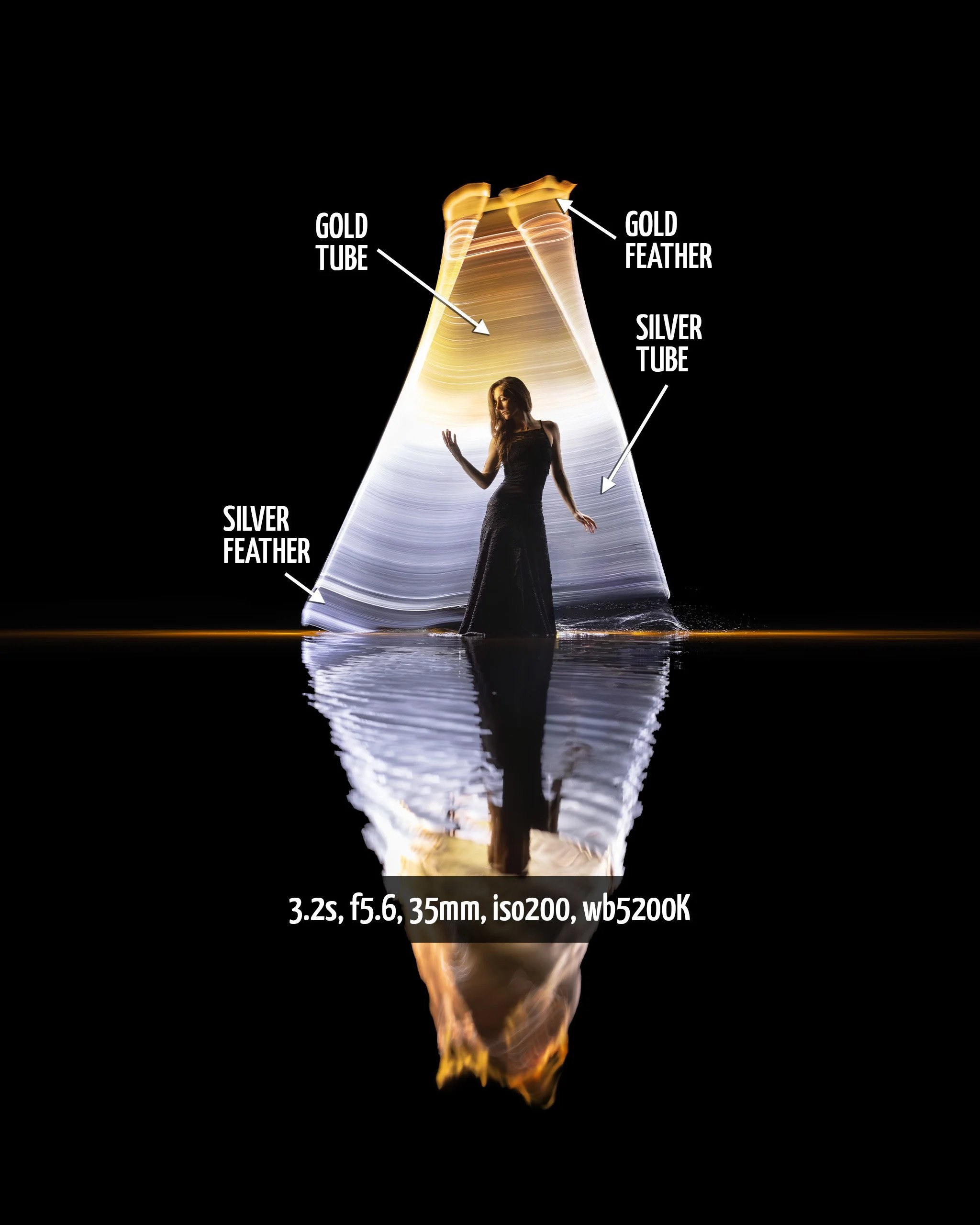 L'idée est d'une simplicité magnifique. On glisse une lampe torche dans un tube translucide, on entre dans un paysage sombre, et on déplace cette lumière pendant une longue pose. Ce qui rend le résultat si particulier, ce n'est pas la complexité du matériel, mais la façon dont le tube transforme un faisceau concentré en un large ruban de lumière propre qui se lit clairement dans l'environnement.