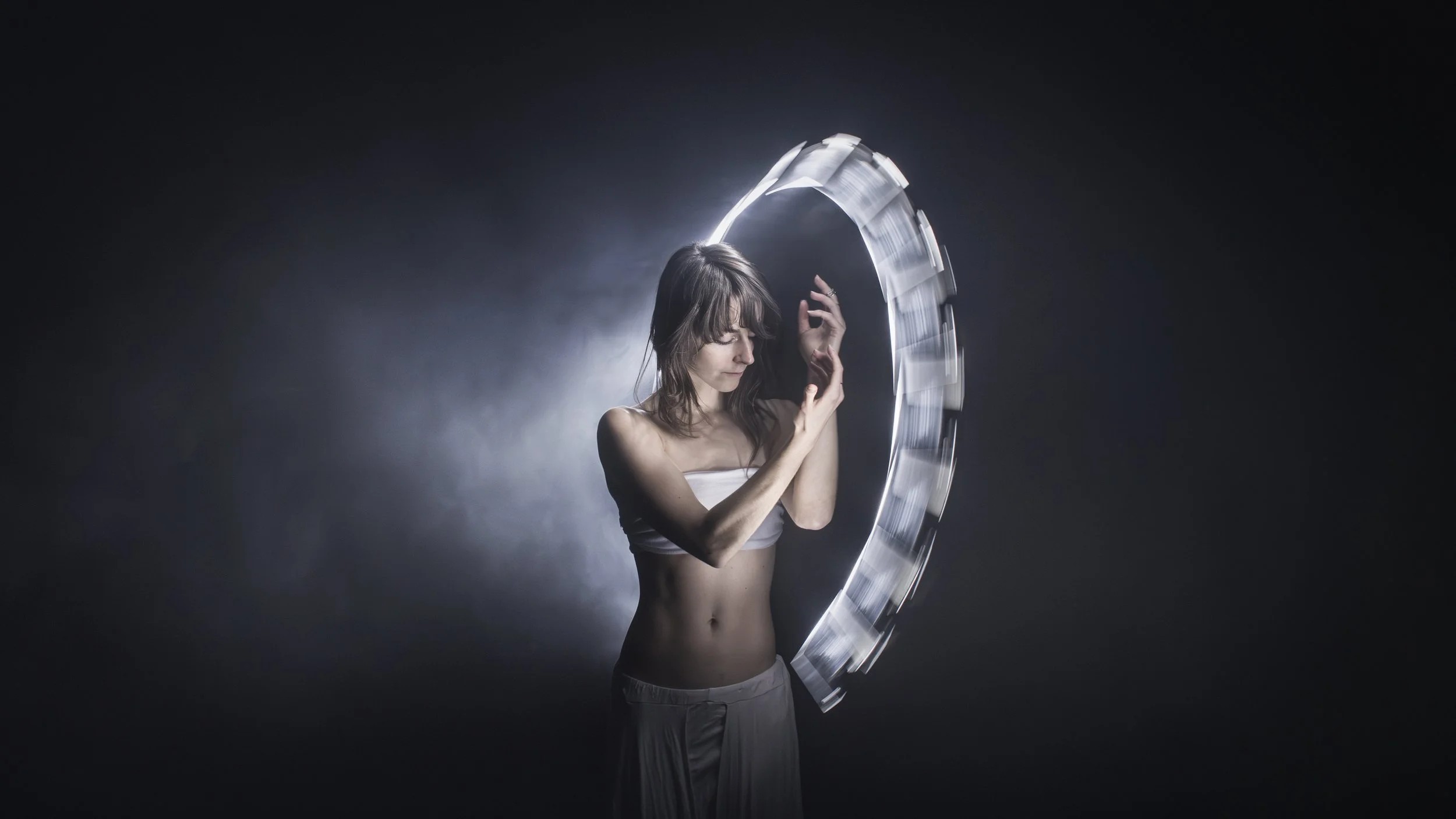 Kim is illuminated solely by the light-painting tool, which also creates the glowing circle in the image. This dual-purpose lighting highlights the subject beautifully while separating them from the background and adding a touch of creativity with the circular shape. The full technique is demonstrated in our .LightSpin documentary.
