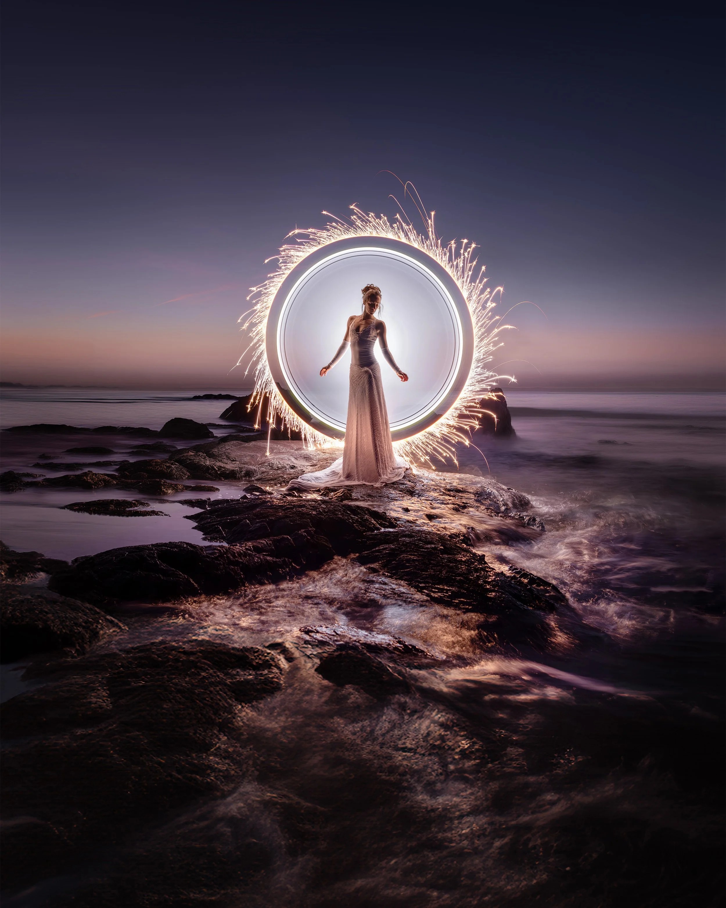 We arrived at our location a bit too late that night, after a long day of driving. It’s a spot we know well—usually perfect for light painting. But this time, it was completely different. The tide was so high that the beach we normally shoot on had completely vanished. There was no room to move, no dry ground to set up, and certainly no way to create the kind of tube light painting images we had in mind.